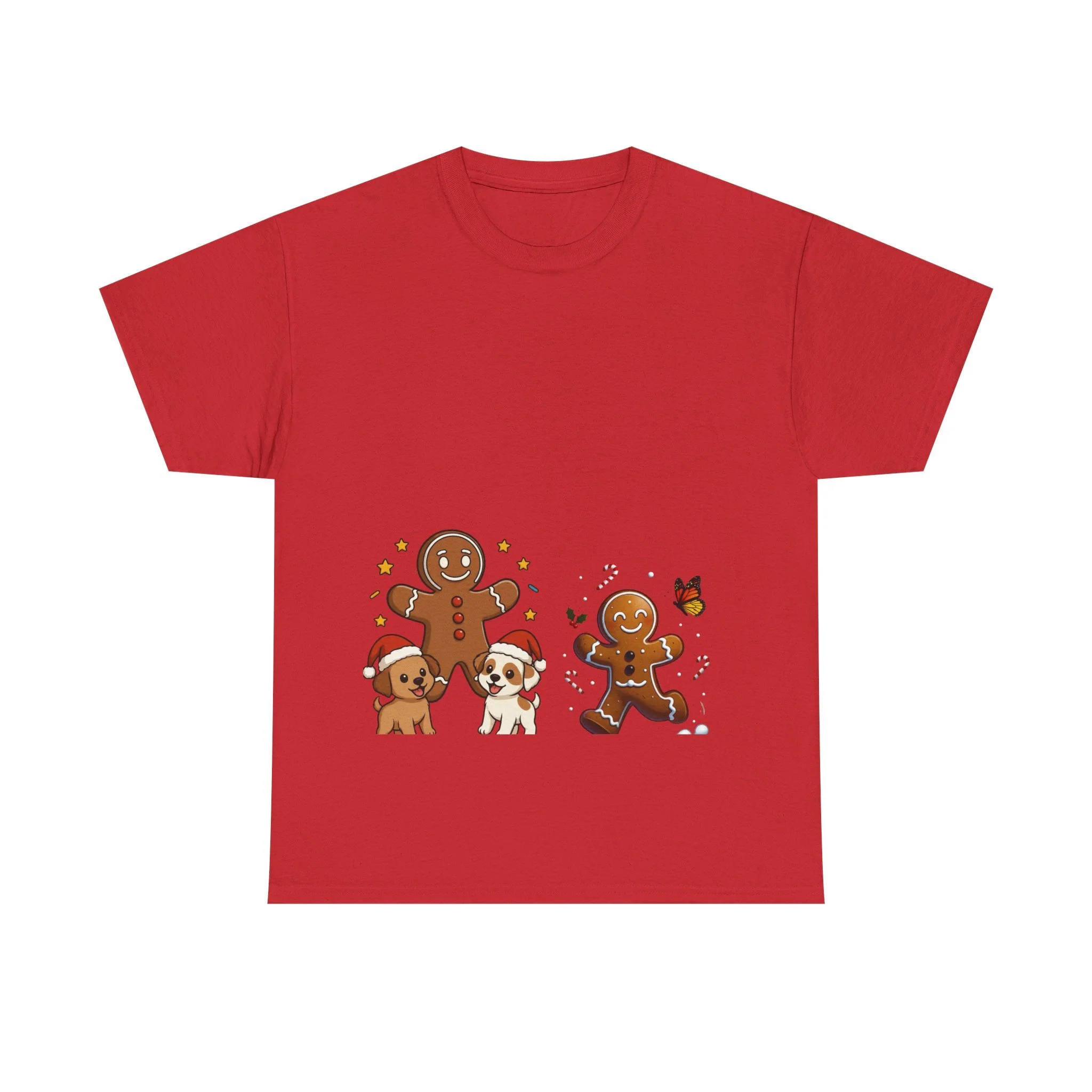 Soft, cozy tee with a playful gingerbread scene that brings warm kitchen memories to everyday wear. Two cheerful gingerbread figures and two tiny pups—one in a Santa hat—are illustrated in a friendly, hand-drawn style with candy-cane accents and a fluttering butterfly. The artwork sits low on the torso for a relaxed, casual look that reads as sweet and whimsical without trying too hard. Wear it while wrapping presents, baking holiday treats, or keeping the mood light on crisp mornings. The breathable, mid-weight cotton feels familiar and lived-in from the first wear, and the tear-away label keeps the neckline irritation-free. Ethically sourced materials and durable printing mean the image stays vibrant through washes, so this tee keeps its story alive year after year.