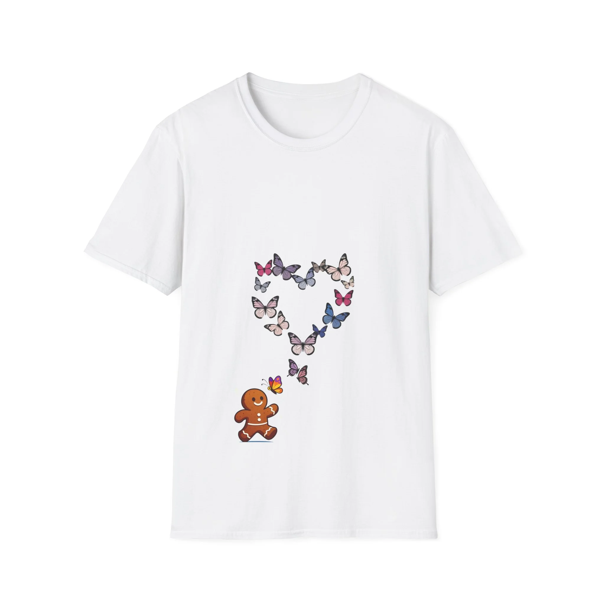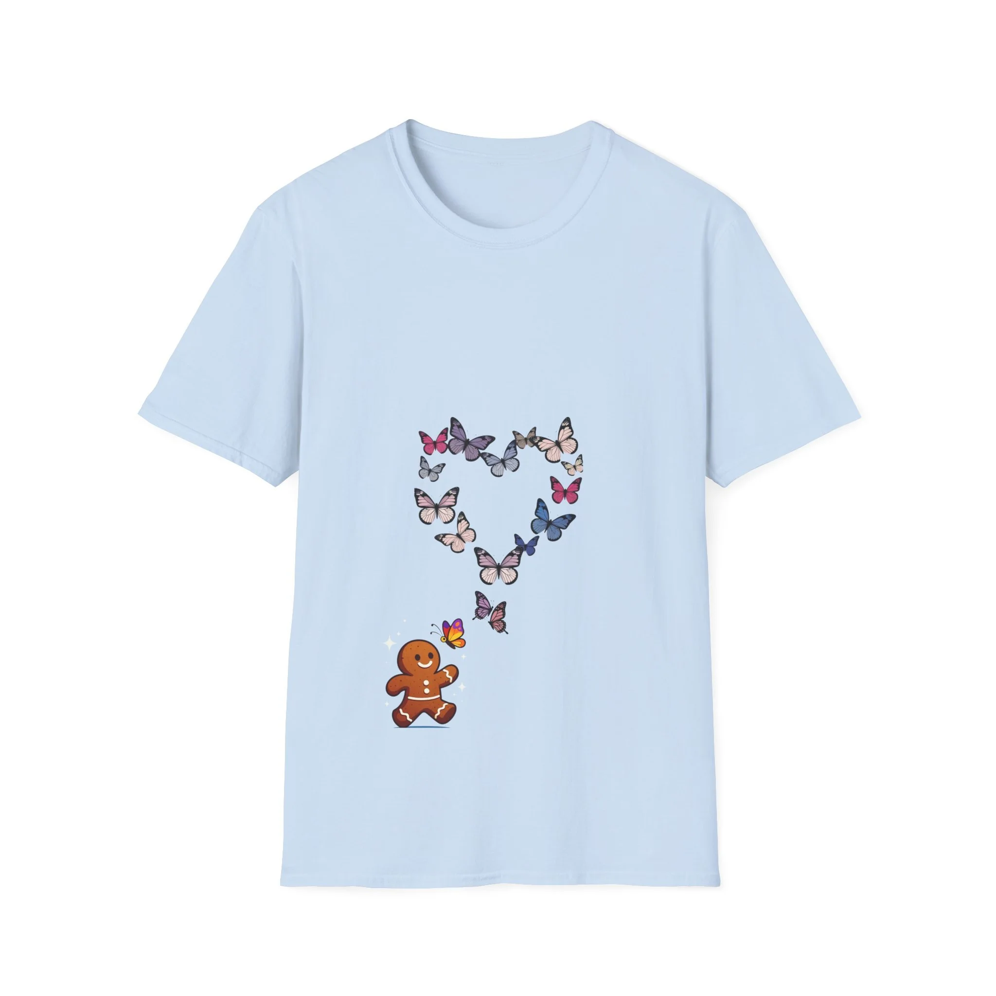 Lightweight, soft, and thoughtfully made — this tee feels like a favorite from the first wear. A small gingerbread figure looks up as a cluster of butterflies forms a delicate heart above, blending playful holiday charm with a whimsical, nature-inspired twist. The crew neck and classic fit sit clean and effortless, while smooth ring-spun cotton keeps the print crisp and comfortable. Wear it on chilly market mornings, cozy cookie-baking afternoons, or whenever you want a quiet nod to seasonal cheer with a gentle, artistic touch.