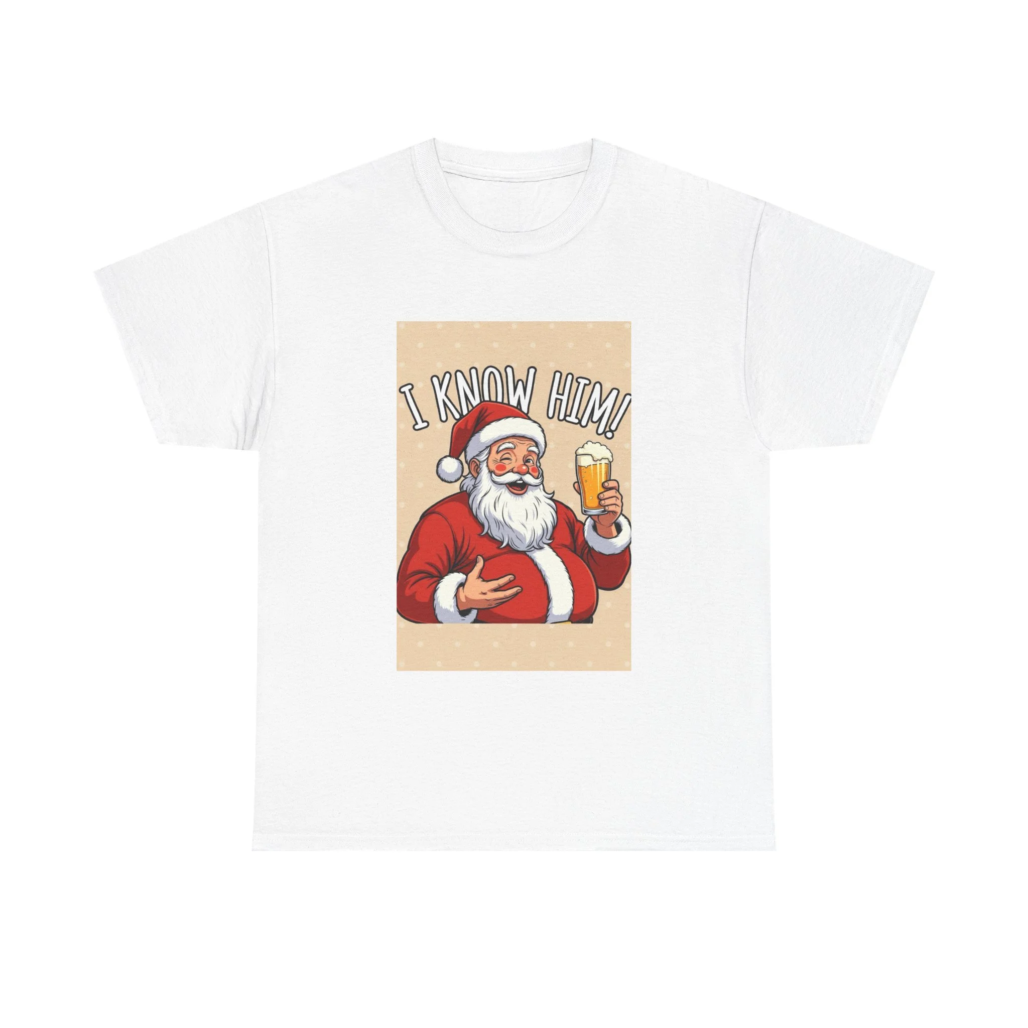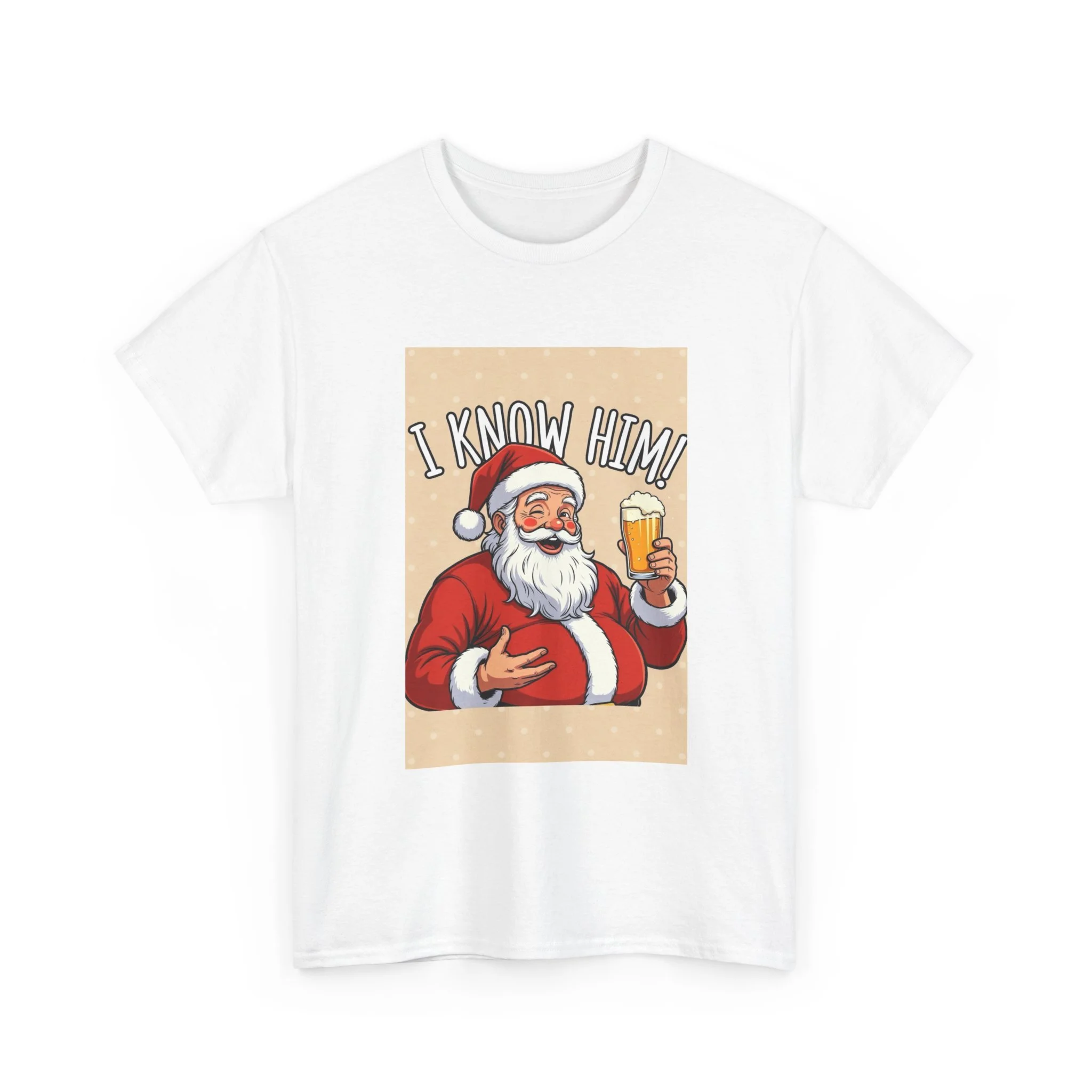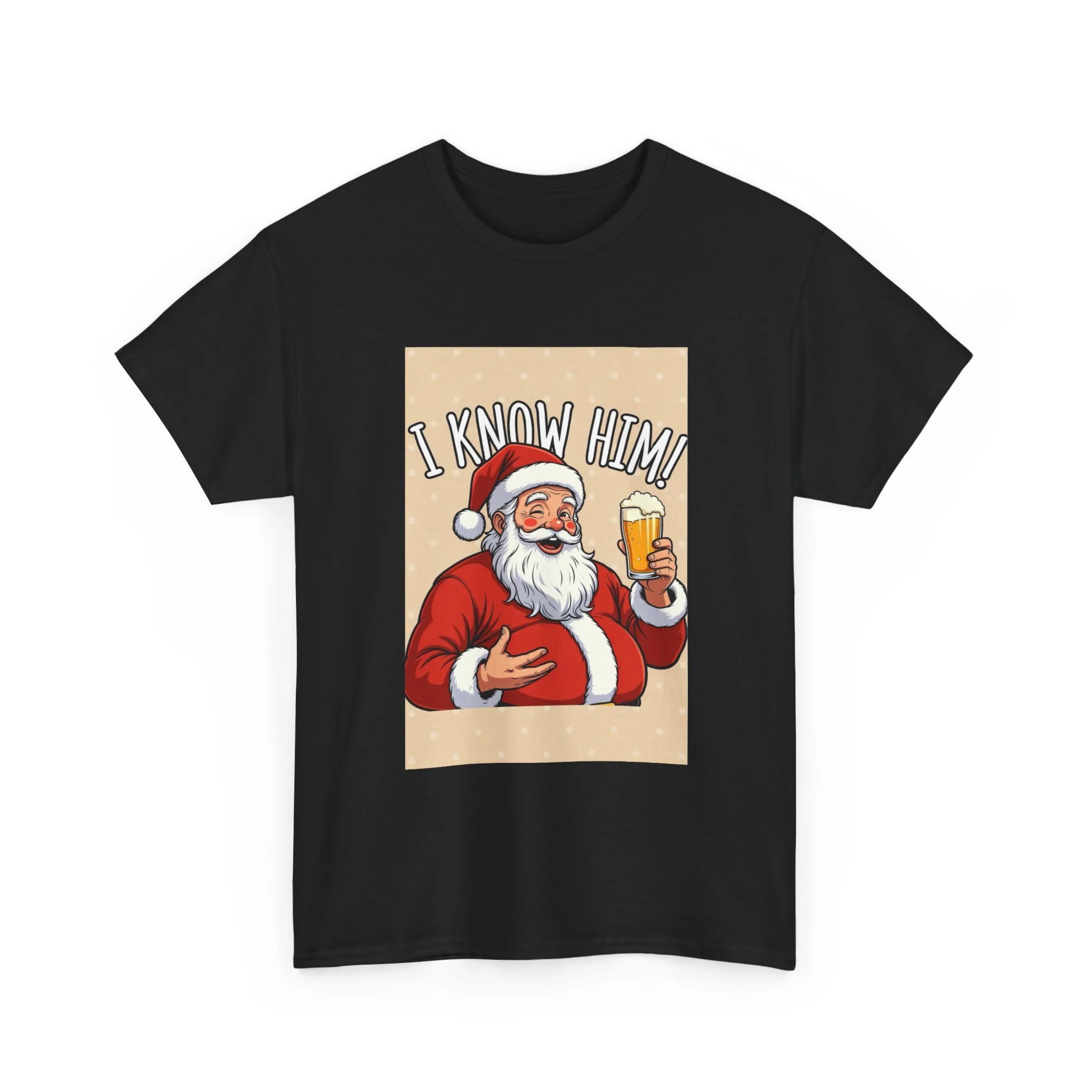 T-Shirt — 'I Know Him!' Funny Santa Christmas Tee (Holiday Party, Ugly Sweater Alternative)